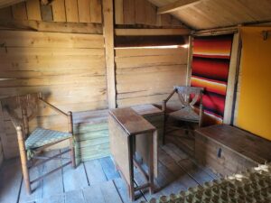 Husets karaktär: Liten stuga med två fasta 90 cm breda sängar i vinkel. Byggnadsår 2018. Låg tröskel med dörr mot vägen, gör det lätt att komma in. Fönsterlucka mot vägen går att fälla ner för ljusinsläpp eller som reception/ telegraf/ handel eller liknande.