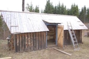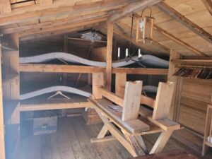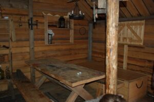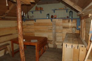 Husets karaktär: Ett ganska långt och högt hus. Ett stort bord med sittplatser som fungerar bra vid möten med mindre grupper, vid hantverk eller som matplats. Uppbyggd sovdel och loft där det också går att sova.