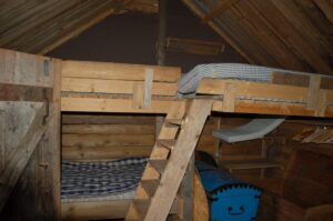 Sängar: våningssäng: : 280×190 med madrasser, överslaf: 150×190 med madrasser. Golvyta för att kunna ställa upp medtagen säng finns.