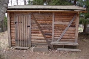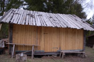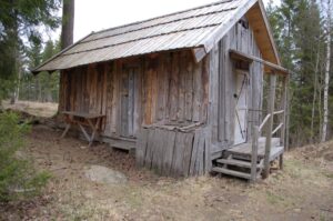 Husets placering: Huset ligger ovanför brunnen, i skogsbrynet till höger om vägen. Till huset hör en fast eldplats på framsidan.