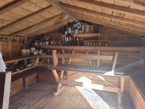 Husets karaktär: Fullt utrustad kök för matlagning över öppen eld på eldstad, i militärens 35-liters grytor, på stekbord och i vedeldad ugn. Vatten pumpar ni upp från brunnen och bär upp till köket med hjälp av ok över axlarna och två spannar. Varmvatten går att värma i en vedeldad vattenkokare, ca 50 liter. Här går det laga mat till flera hundra personer på en gång.