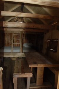 Husets karaktär: Ett litet hus som det fungerar att sova, äta och bo i. Två fasta sängar, över varandra. En liten sittplats under tak på ena kortsidan.