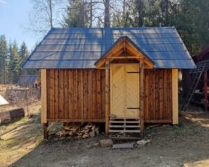 Husets karaktär: Liten stuga med två fasta 90 cm breda sängar i vinkel. Byggnadsår 2018. Låg tröskel med dörr mot vägen, gör det lätt att komma in. Fönsterlucka mot vägen går att fälla ner för ljusinsläpp eller som reception/ telegraf/ handel eller liknande.